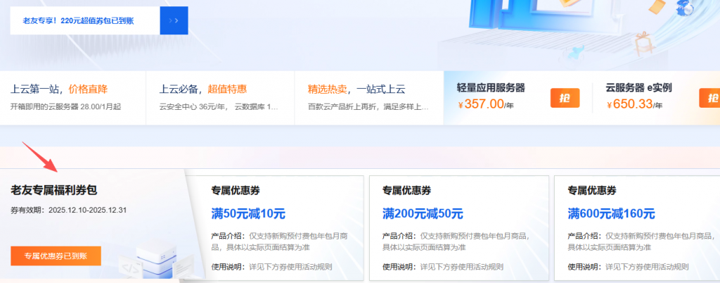 - 仅支持「官网目录价/官网折扣价(部分产品)」商品使用,长效低价类营销商品不支持叠加优惠券(如:ECS 2核2G 99元/年、ECS 2核4G 199元/年、 轻量服务器 2核2G 平台新客优惠活动、数据库产品首购活动等);
