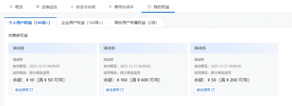 说明:PC或者手机端订单最终是否支持满减券,请以下单页实际情况为准;领取之后可登录阿里云控制台-我的权益,页面进行查询,如下图所示: