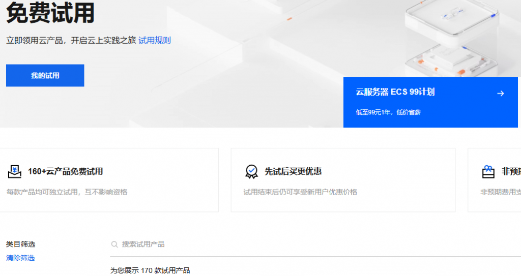 第一步:我们进入阿里云的云产品试用页面:https://free.aliyun.com
