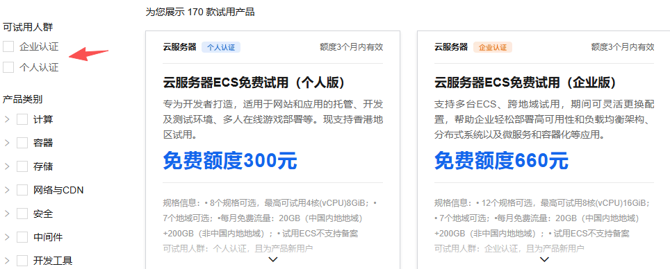 如果我们想要试用云服务器,步骤跟试用轻量应用服务器一样,选择好个人版或者企业版之后,点击试用,然后选择对应的配置,注意查看免费可用时长,如下图所示: