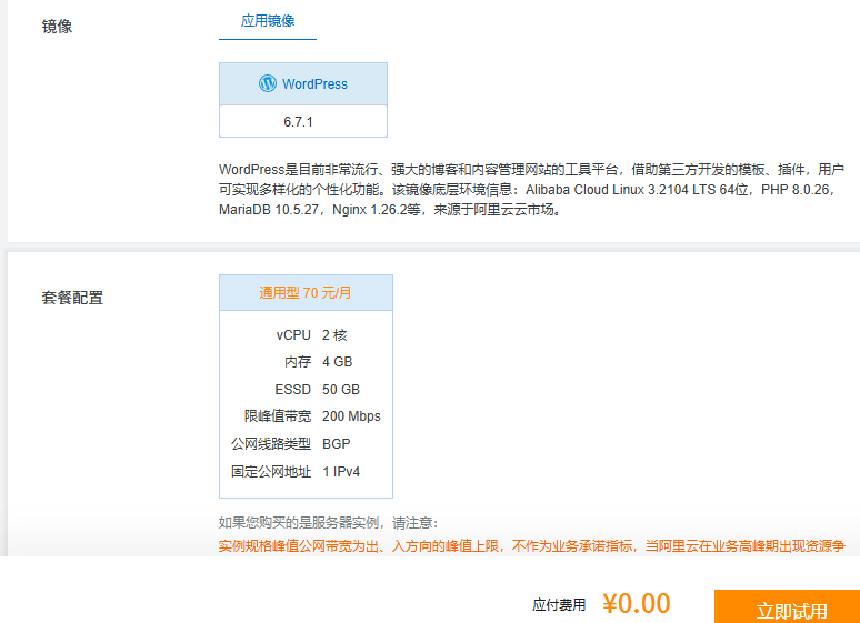 第四步:选择想要试用的轻量应用服务器预装镜像,目前2核4G配置可选的预装镜像有宝塔Linux面板、WordPress镜像、Docker CE镜像和WooCommerce镜像,以WordPress镜像为例,点击立即试用之后,再点击0元试用即可,如下图所示: