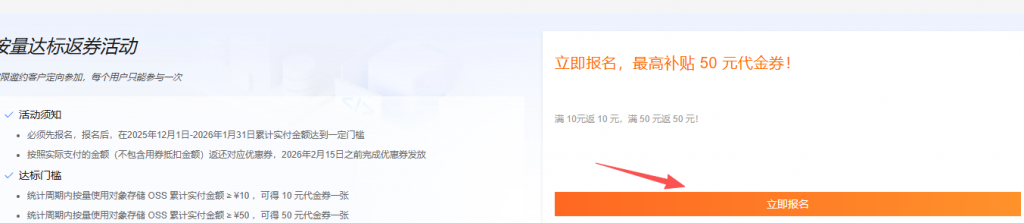 - 报名入口:点此进入阿里云oss对象存储满返代金券活动