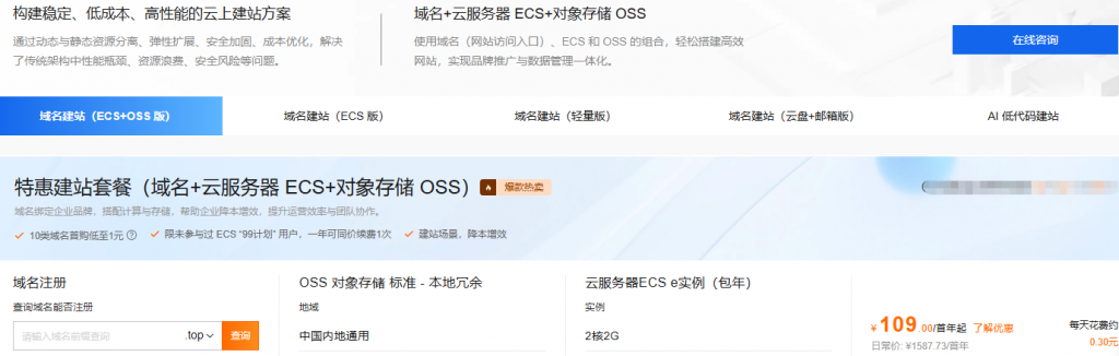 1、特惠建站套餐(域名+ECS+建站)