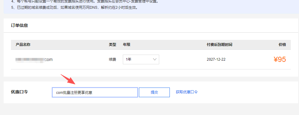 这样我们就通过使用域名优惠口令的方式成功让自己续费.com域名时,便宜了5元。