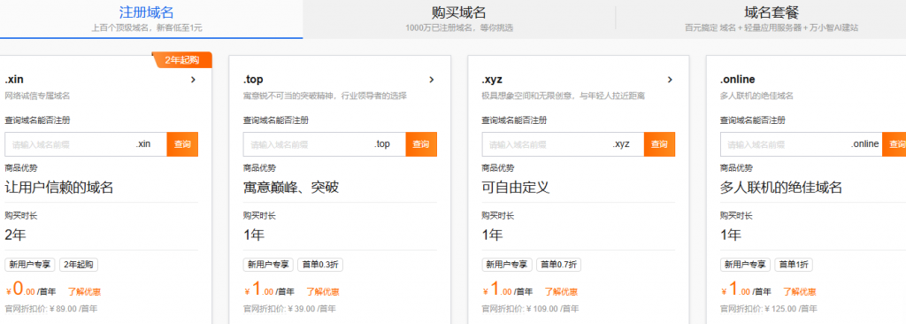 - .xyz域名:极具想象空间和无限创意,与年轻人拉近距离,可自由定义,购买时长1年,新用户专享首单0.7折,首年仅需¥1.00(官网折扣价:¥109.00/首年)。