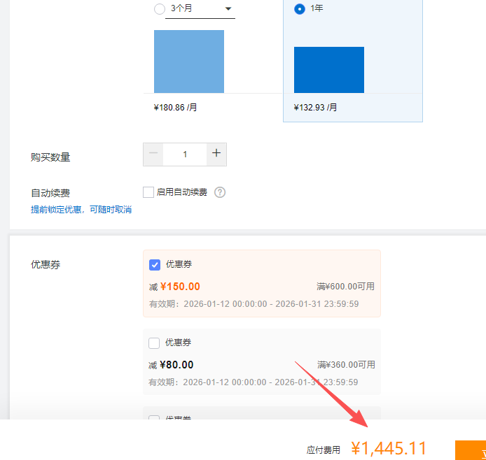 例如小编购买一台经济型e实例4核8G1M带宽云服务器,活动显示价格为1595.11元1年,购买中可使用10元、80元和150元的优惠券,最高可再减免150元,实际购买价格为1445.11元,如下图所示: