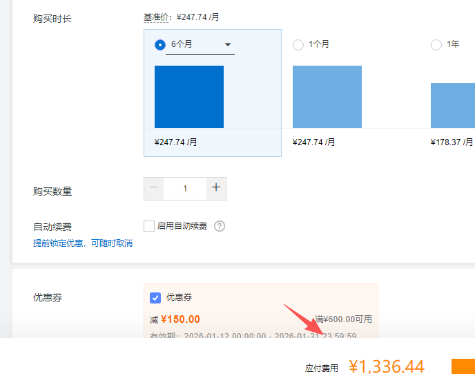 例如小编购买一台通用型g9i实例2核8G1M带宽6个月,活动显示价格为1486.44元1年,购买中可使用10元、80元和150元的优惠券,最高可再减免150元,实际购买价格为1336.44元,如下图所示: