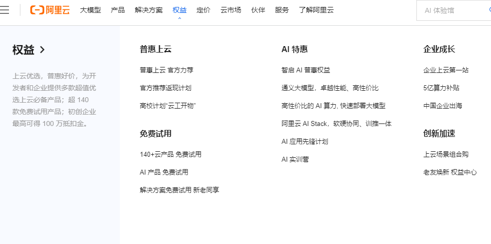 权益中心是阿里云针对个人和企业认证用户提供的优惠权益平台,为开发者和企业提供多款超值优选上云必备产品;超 140 款免费试用产品;初创企业最高可得 100 万抵扣金。2026年截至目前,权益中心提供了普惠上云、高校计划“云工开物”‘’免费试用、AI 特惠、通义大模型特惠、企业上云第一站、5亿算力补贴、中国企业出海、创新加速、上云场景组合购、老友焕新等活动,以下是权益中心内这些活动的简介,以供参考。