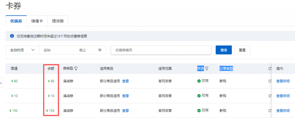 领取之后,我们可进入阿里云控制台,进入费用,然后进入左侧卡券管理,即可看到所领取的优惠券详情,如下图所示: