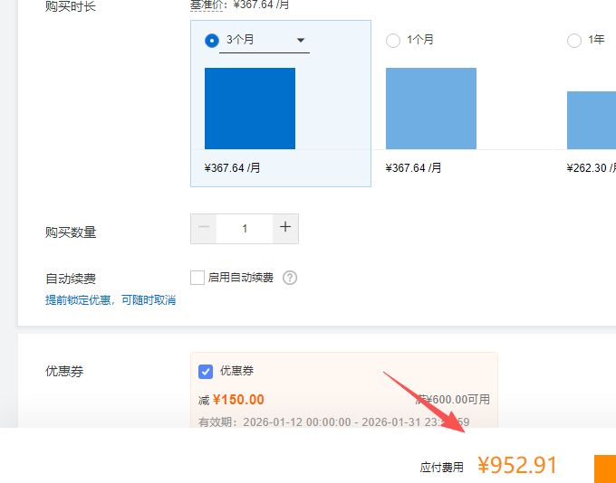 第三步:点击购买之后,选择云服务器地域、镜像、带宽之后,勾选使用优惠券,由于订单金额已满600元,因此可使用的优惠券金额为10元、80元和150元,我们勾选使用150元优惠券,实际购买价格只要952.91元,如下图所示: