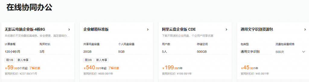 - 无影云电脑企业版-4核8G:计算套餐 120小时/月,199.00元/1年起;