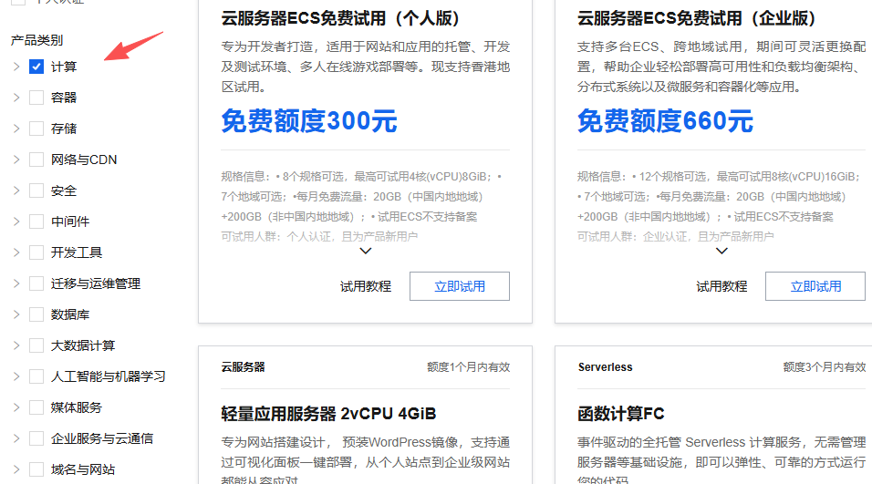 在产品类别选择自己想要免费试用的云产品种类,这里我们以个人用户试用云服务器ECS产品为例,选择计算 - 云服务器。云服务器ECS是阿里云提供的一种弹性计算服务,具有高性能、高可靠性、高安全性等特点,能够满足不同用户的业务需求。