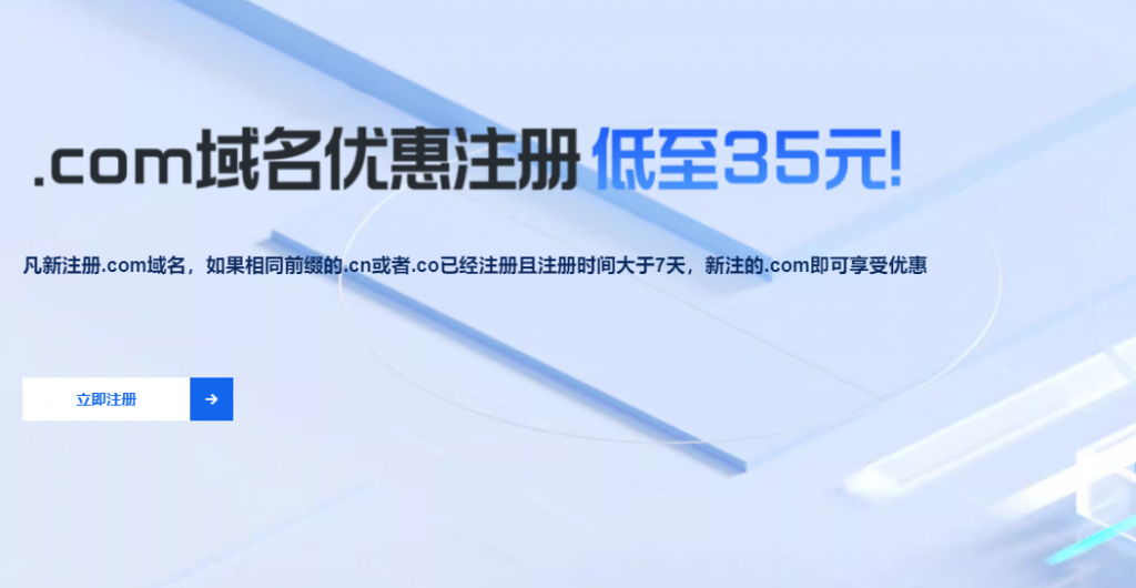 凡新注册.com域名,如果相同前缀的.cn或者.co已经注册且注册时间大于7天,新注的.com即可享受.com低至35元。
