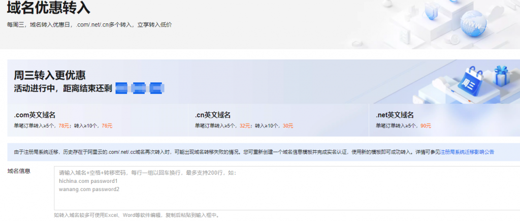 域名优惠转入,每周三,域名转入优惠日,.com/.net/.cn多个转入,立享转入低价。