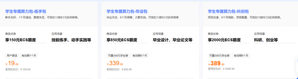 - 学生专属算力包-练手包:新手友好,价格19元,享150元ECS额度,帮助学生技能练手、动手实践等,1个月速成,额度充足,可抵扣13款ECS实例规格。