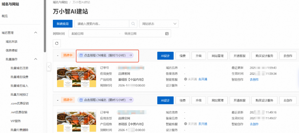 购买完成万小智AI建站之后,进入建站产品控制台,在建站实例列表里,点击下图所示【点击领取.CN域名】按钮,打开领取窗口;注意:务必在建站产品购买后7个自然日内领取,逾期视为自动放弃。