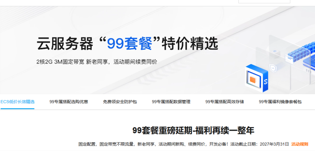 - 优惠时长限制:在活动时间内购买指定配置产品,可持续享受包1年99元优惠,不限新购与续费,但新购与续费可享受优惠价格的服务时长不超过2年。