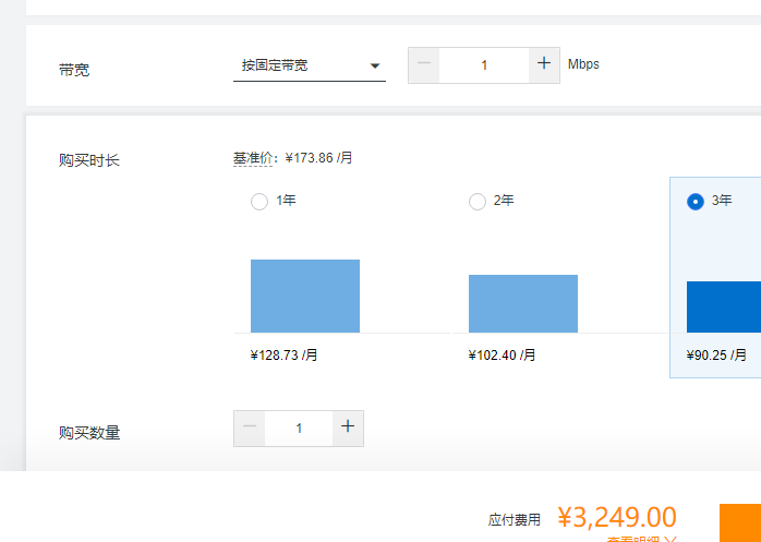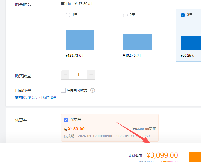 例如小编购买一台经济型e实例4核8G1M带宽云服务器,活动显示价格为3249元3年,购买中可使用10元、80元和150元的优惠券,最高可再减免150元,实际购买价格为3099元,如下图所示: