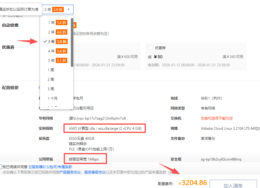 如果我们是想购买其他实例规格的云服务器话,可以选择通过云服务器ECS产品详情页通过自定义购买模式选择其他实例规格和3年时长,针对不同实例规格和购买时长,阿里云也推出了不同的折扣,以AMD 计算型 c8a实例为例,目前选择4核8G配置年付可享受1年5.4折、2年4.8折、3年3.9折、4年3.4折、5年3.1折的优惠,例如4核8G配置1M带宽,40GiB ESSD云盘,3年享受3.9折之后的价格为3204.86元,如下图所示: