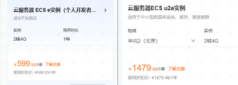 通过上表可以看出,通用算力型u2a实例和经济型e实例在价格上存在一定的差异。相同配置情况下,u2a实例的活动价格要低于经济型e实例,这是因为上面价格展示的u2a实例价格为新用户价格,目前新用户选购u2a实例可享受2.5折的优惠,如果是老用户的话,选择u2a实例的价格则要高于经济型e实例,以2核4G配置为例,经济型e实例的活动价格为599.93元1年起,而u2a实例的价格为1479.481年起,二则对比图如下: