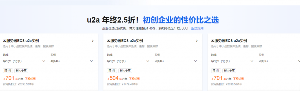- 新用户首次购买通用算力型u2a实例指定配置:2核2G/2核4G/2核8G/4核4G/4核8G/4核16G,40-100GB系统盘(ESSD Entry 云盘/ESSD 云盘/ESSD AutoPL 云盘)不含数据盘,1-5M带宽,可享受包1年2.5折的优惠折扣。