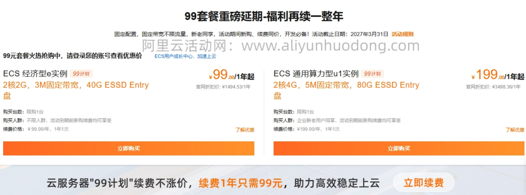 在活动时间内(2027年3月31日之前),99元一年和199元一年云服务器每年最多可以以新购同价的优惠价格续费1次,1次1年,直到活动时间结束持续享受续费优惠。备注:若续费其他实例时使用了低价权益,原低价产品实例将无法再享受低价权益。