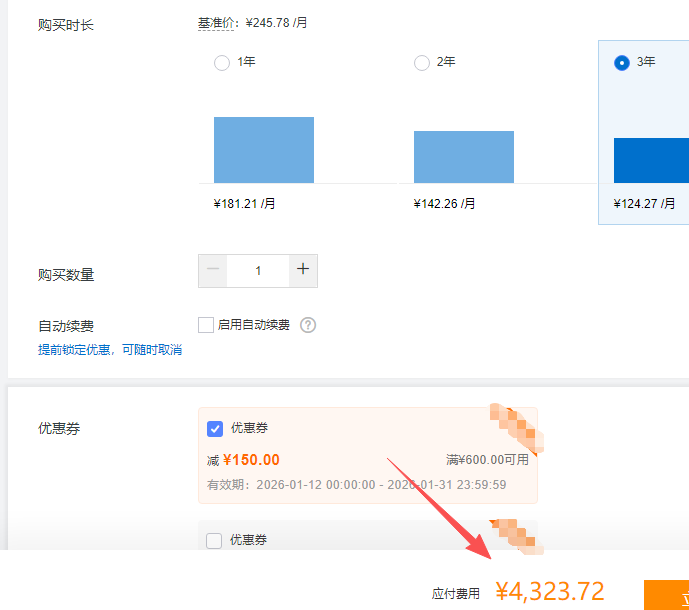 例如小编购买一台经济型e实例4核16G1M带宽云服务器,活动显示价格为4473.72元3年,购买中可使用10元、80元和150元的优惠券,最高可再减免150元,实际购买价格为4323.72元,如下图所示: