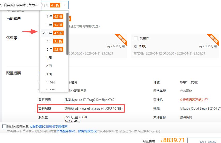 如果我们是想购买其他实例规格的云服务器话,可以选择通过云服务器ECS产品详情页通过自定义购买模式选择其他实例规格和3年时长,针对不同实例规格和购买时长,阿里云也推出了不同的折扣,以通用型 g8i实例为例,目前选择4核16G配置年付可享受1年6.7折、2年5.7折、3年4.5折、4年3.8折、5年3.3折的优惠,例如4核16G配置1M带宽,40GiB ESSD云盘,3年享受4.5折之后的价格为8839.71元,如下图所示: