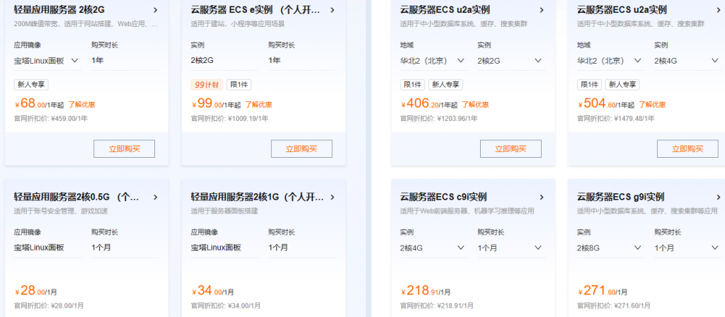 当然,在阿里云目前的活动中,还有经济型e实例2核2G3M带宽40G ESSD Entry云盘99元1年;通用算力型u1实例2核4G5M带宽80G ESSD云盘企业专享199元1年,轻量云服务器2核2G200M峰值带宽38元一年,以及通用算力型u2a实例2.5折起,九代c9i、g9i、r9i等实例1年付6.4折起等其他实例规格的云服务器。只是购买时长最多只能选择1年,更多云服务器配置和实时价格可通过云资源产品直降活动查询:https://www.aliyun.com/benefit/select/cloud-discount