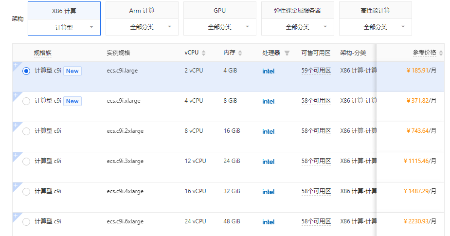 c9i提供从2核4GB到192核384GB的全配置覆盖,按量付费与包年包月双模式支持。以下目前计算型c9i实例的最新按量和包年包月收费标准: