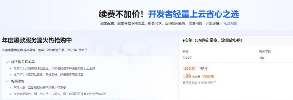 经济型e实例云服务器是阿里云为入门级用户和企业级用户打造的一款高性价比云服务器产品。它以稳定可靠的性能和超值的价格,赢得了广大用户的青睐。接下来,我们将详细介绍如何购买这款99元一年的经济型e实例云服务器。