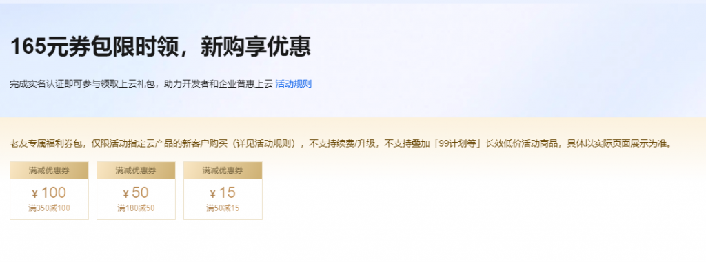 购买之前可先根据自己账号实名认证情况领取阿里云的各种优惠券,2026年,阿里云针对学生用户有无门槛优惠券,企业用户则有出海补贴、迁云补贴等优惠券,个人用户也有新客户专享满减券等,同时阿里云针对用户免费赠送165元优惠券,订单满50元减15元、满180元减50元、满350元减100元,先领券再购买,可在活动价格基础上额外再获得一定金额的减免。详情可通过阿里云权益中心了解:https://www.aliyun.com/benefit