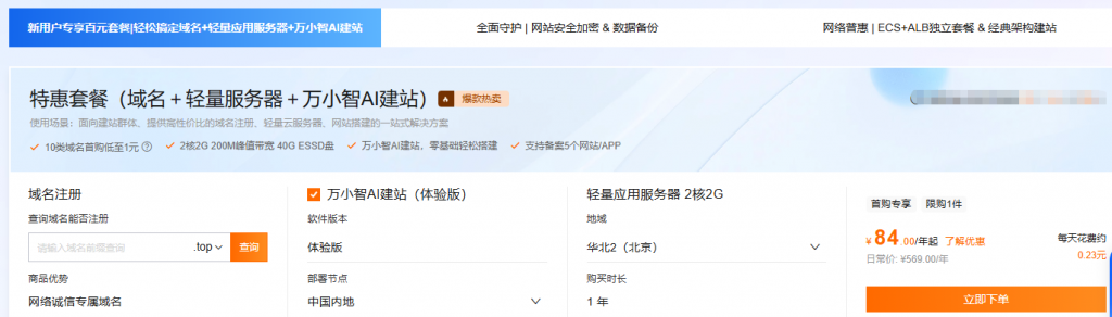 1.新用户专享百元套餐 特惠套餐(域名+轻量服务器+万小智AI建站)