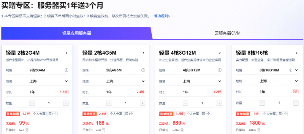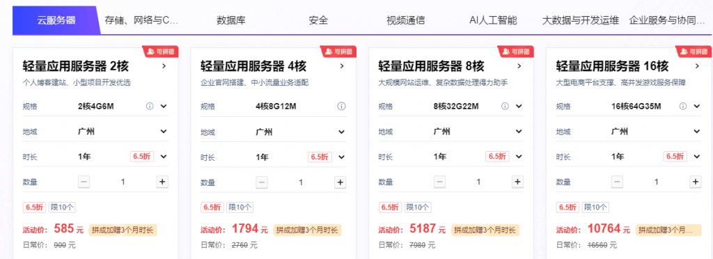 - 轻量应用服务器 4核:企业官网搭建、中小流量业务适配,活动价1794元起。
