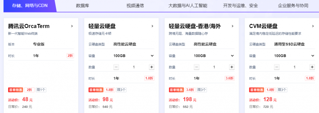 存储、数据库、视频通信等热门产品新用户专享特惠。具体产品及价格请关注活动页面。