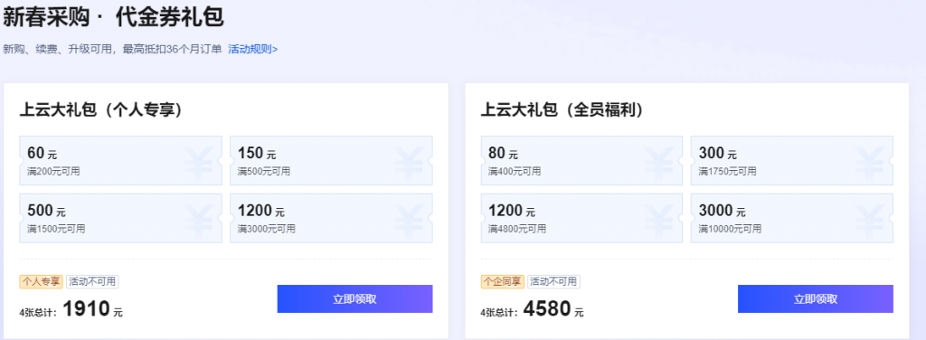 腾讯云15张代金券,总额6049,满200减100元,满2000减1000元(不定期推出)。