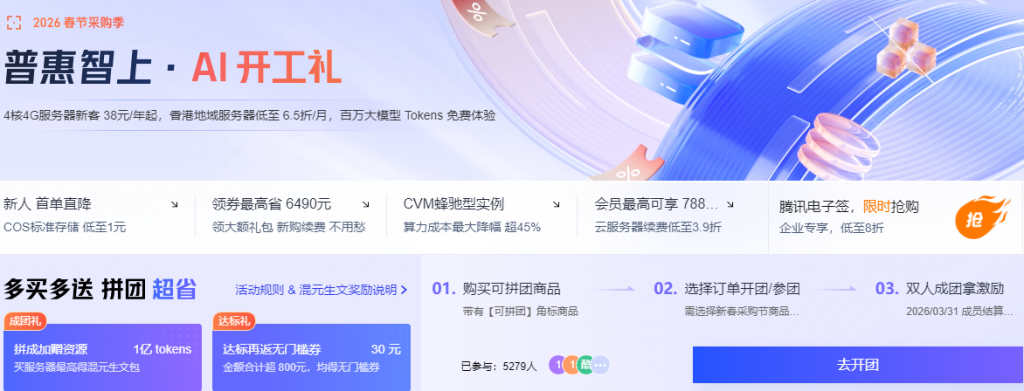 腾讯云2026年第一波大促活动开启,4核4G服务器新客 38元/年起,香港地域服务器低至 6.5折/月,百万大模型 Tokens 免费体验。活动主要内容包括领券最高省6490元,领大额礼包 新购续费 不用愁;CVM蜂驰型实例,算力成本最大降幅 超45%;会员最高可享 7880元券包,云服务器续费低至3.9折;腾讯电子签,限时抢购,企业专享,低至8折。活动直达:点此进入腾讯云2026年新春采购季大促活动