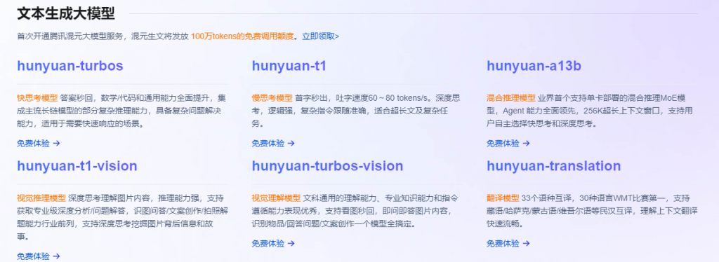 - 文本生成大模型:首次开通发放100万tokens免费调用额度,包括快思考模型hunyuan-turbos、慢思考模型hunyuan-t1、混合推理模型hunyuan-a13b等,满足不同场景需求。