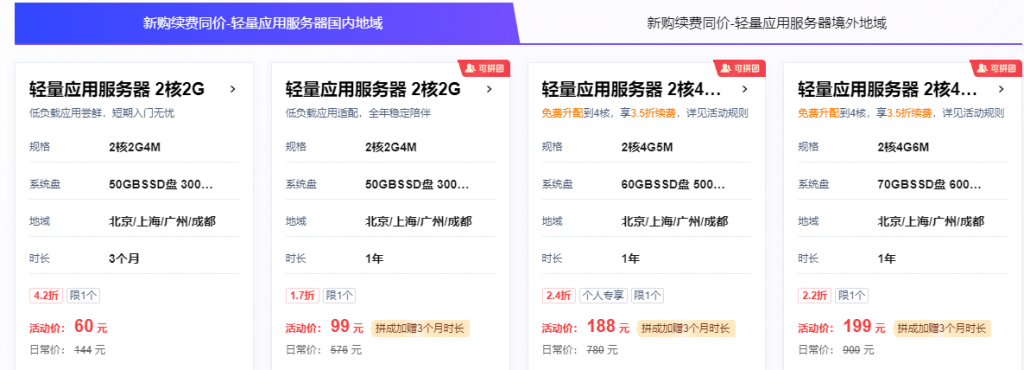 同价续费商品,每个配置全网(包含其他活动页面)限新购1次,续费1次,详情参见销售卡片。活动商品包括新购续费同价-轻量应用服务器(国内/境外地域)。
