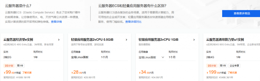- 买服务器:云服务器经济型e实例2核2G配置99.00元/1年,轻量应用服务器2vCPU 0.5GiB配置28.00元/1月、2vCPU 1GiB配置34.00元/1月,云服务器通用算力型u1实例2核4G配置199.00元/1年。
