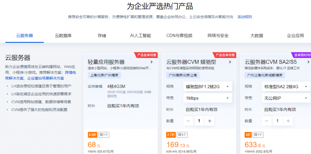 4核4G3M38元,云服务器CVM1年2折3年3.5折,gpu云服务器0.8折。