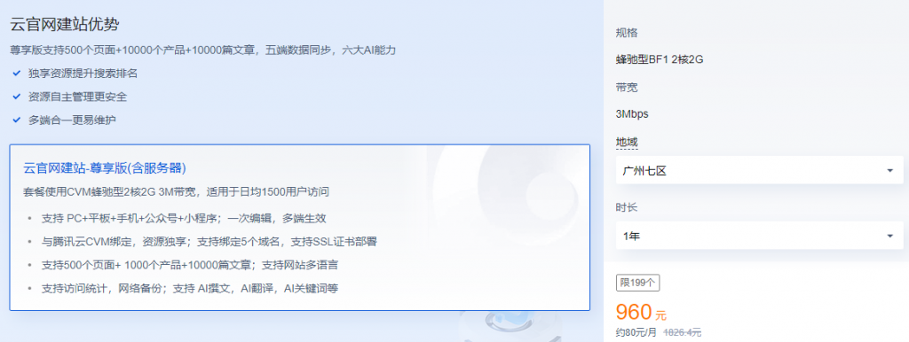 - 云官网建站-尊享版(含服务器):套餐配置CVM蜂驰型2核2G 3M带宽,适用于日均1500用户访问量;支持PC、平板、手机、公众号及小程序五端同步;与腾讯云CVM深度绑定,资源独享;支持绑定5个域名,并可部署SSL证书;提供500个页面、1000个产品及10000篇文章的展示空间;内置访问统计、网络备份功能;集成AI撰文、AI翻译、AI关键词等智能能力。