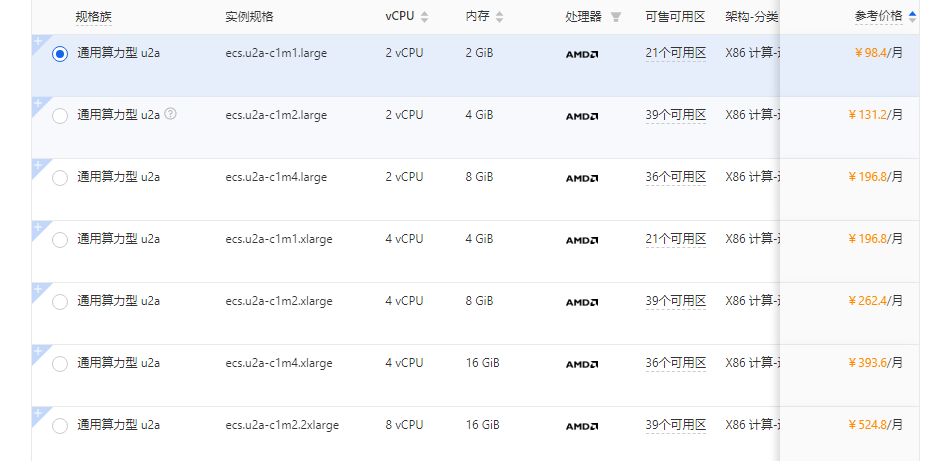 | ecs.u2a | ecs.u2a-c1m2.large | 2 vCPU | 4 GiB | 0.2733元/小时 | 131.2元/1月 | 1102.08元/1年 | 2172.67元/3年 | 2519.04元/5年 |