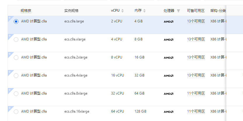 | AMD 计算型c9a (ecs.c9a.large) | 2核4G | 1M-5M | 20G ESSD云盘 | 181.69元/1个月 545.06元/3个月 1090.13元/6个月 | 1897.82元/1年/1M带宽 2132.42元/1年/2M带宽 2387.42元/1年/3M带宽 2642.42元/1年/4M带宽 2938.22元/1年/5M带宽 |