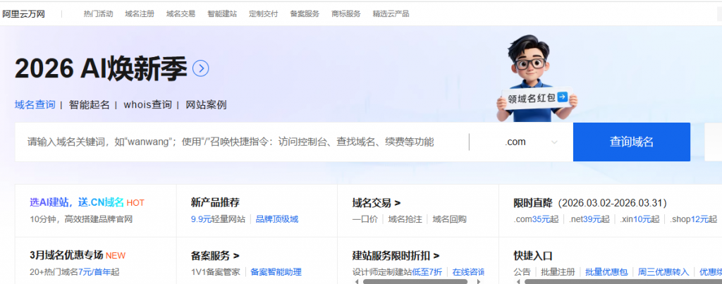 2026年阿里云万网域名注册活动更新,不仅提供AI建站服务并赠送.CN域名,助力用户10分钟高效搭建品牌官网,还推出3月域名优惠专场,20余种热门域名低至7元起。此外,还有限时直降活动,包括.com、.net、.cn、.xin等多种域名类型,价格优惠力度大。无论是个人还是企业用户,都能在阿里云万网找到适合自己的域名注册方案,享受便捷、高效的域名服务。