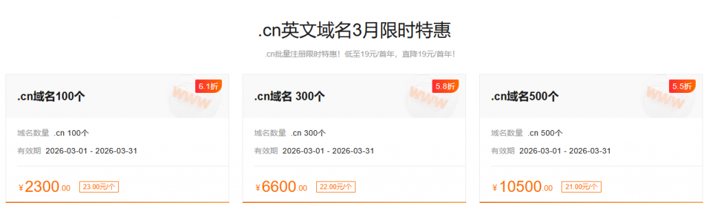 .cn19元起:.cn批量注册限时特惠!低至19元/首年,直降19元/首年!