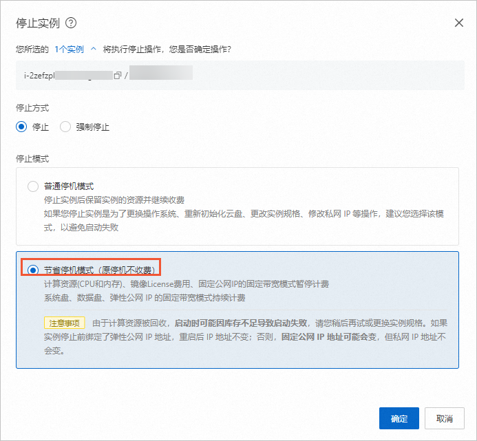 - 在弹出的停止实例对话框中,停机模式选择节省停机模式,单击确定。