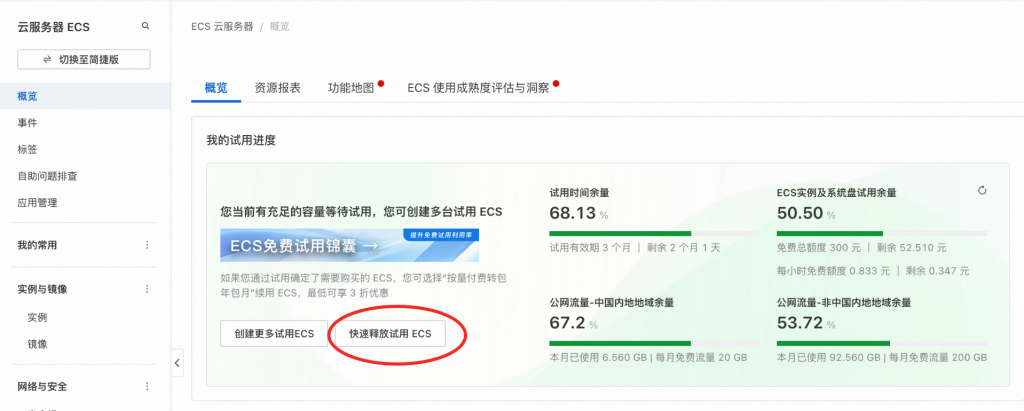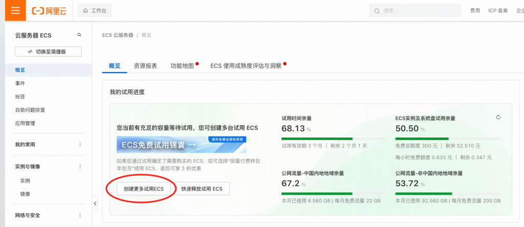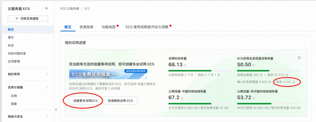 您可以登录ECS管理控制台,在概览页的我的试用进度区域,查看当前剩余免费额度,包括:试用时间余量、ECS实例及系统盘试用余量、公网流量-中国内地地域余量、公网流量-非中国内地地域余量。