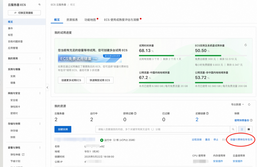 试用的ECS实例默认采用按量付费,如果您想继续使用且节约使用成本,建议将实例计费方式转为包年包月。