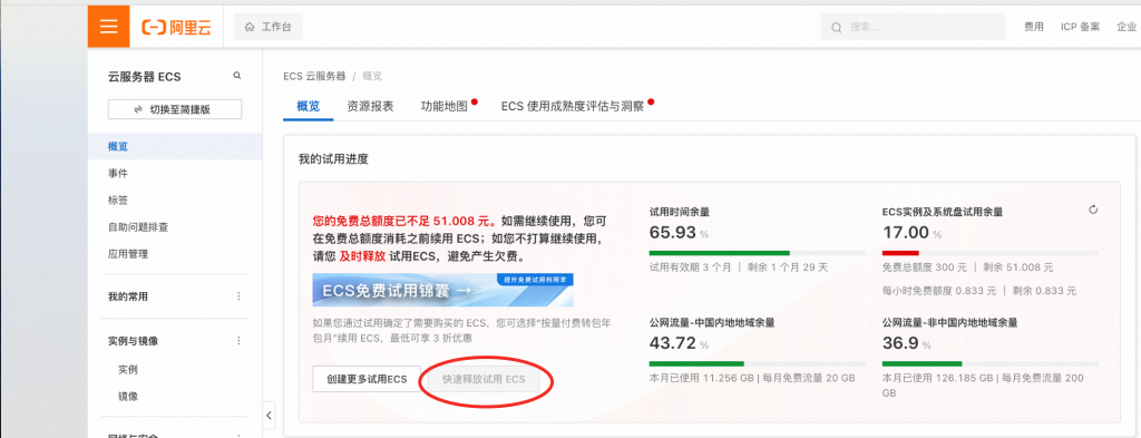 - 试用的ECS的台数较多、配置较高,导致免费额度消耗过快。建议您在试用中登录ECS控制台关注免费额度消耗进度,在收到额度不足20%的时候,合理安排您的试用资源。